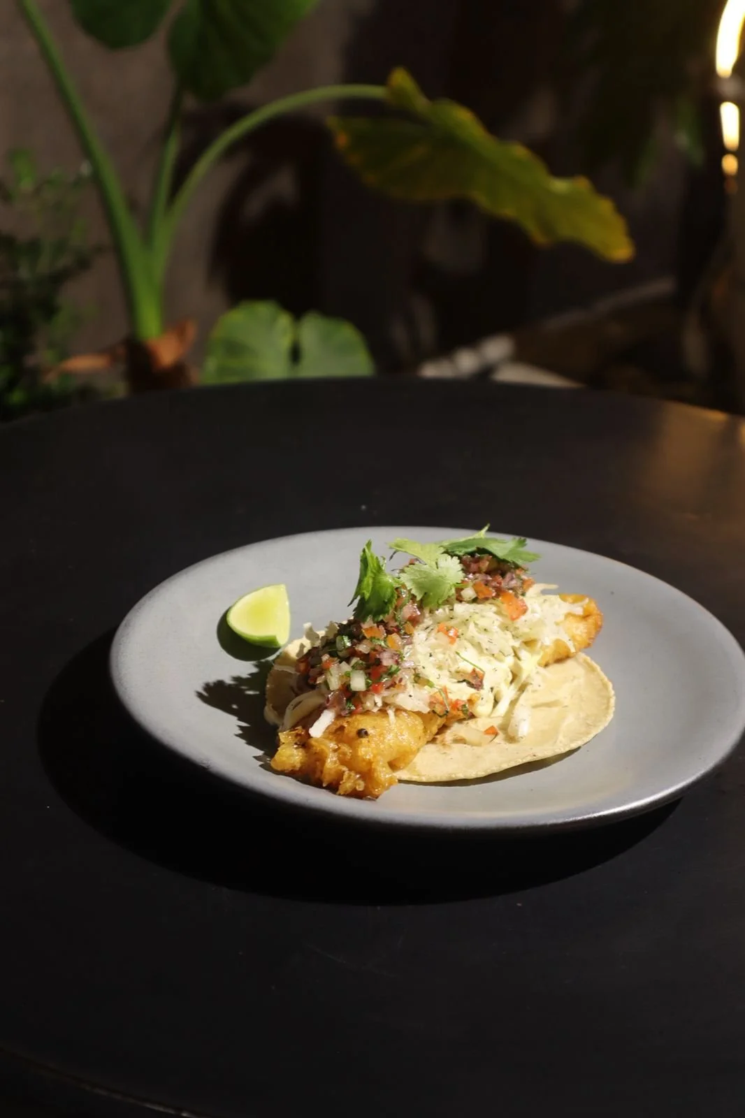 Tortilla de maíz, pescado capeado con col, pico de gallo y aderezo de macha verde